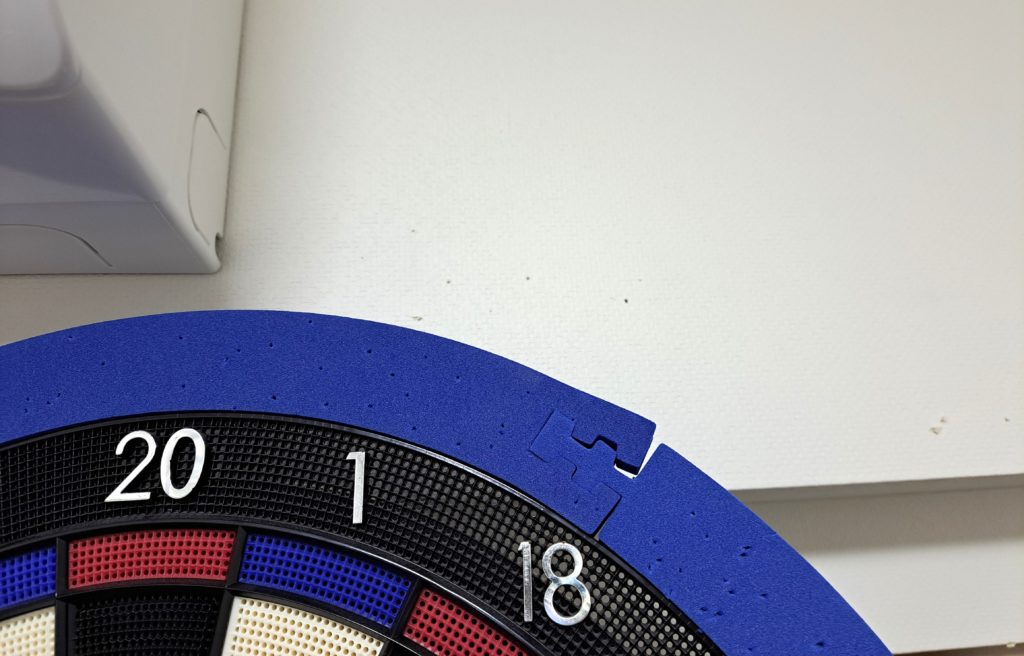それから、ボードの周囲にはできるだけ何も置かないようにしましょう。ダーツは時々ボードに弾かれることがあるのですが、そうすると本当に「なぜ?」という予測不能な場所に飛んでいきます。ボードの周囲がごちゃごちゃしていると、きちんと目で追っていたとしてもすぐ行方不明になります。