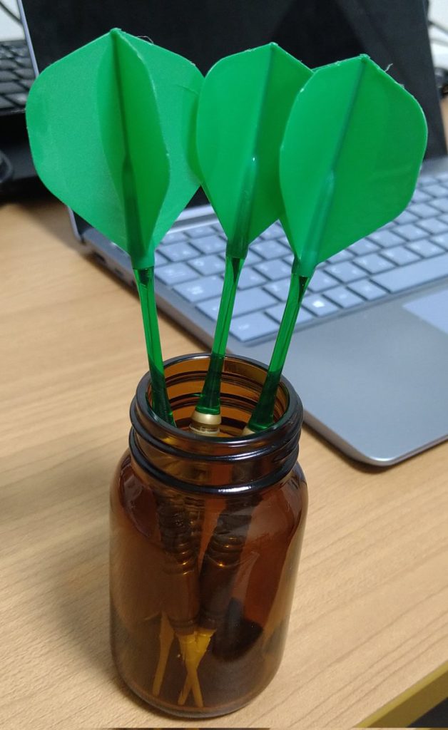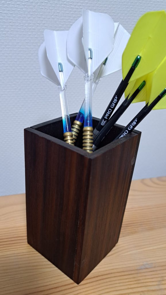 ペン立てみたいに無造作に放り込んで立てておけるのが一番楽だよなぁと思うのですが、筆記用具と比べてダーツはとても短いので、大抵の市販のペン立てだとすっぽり埋もれてしまうんですね。
