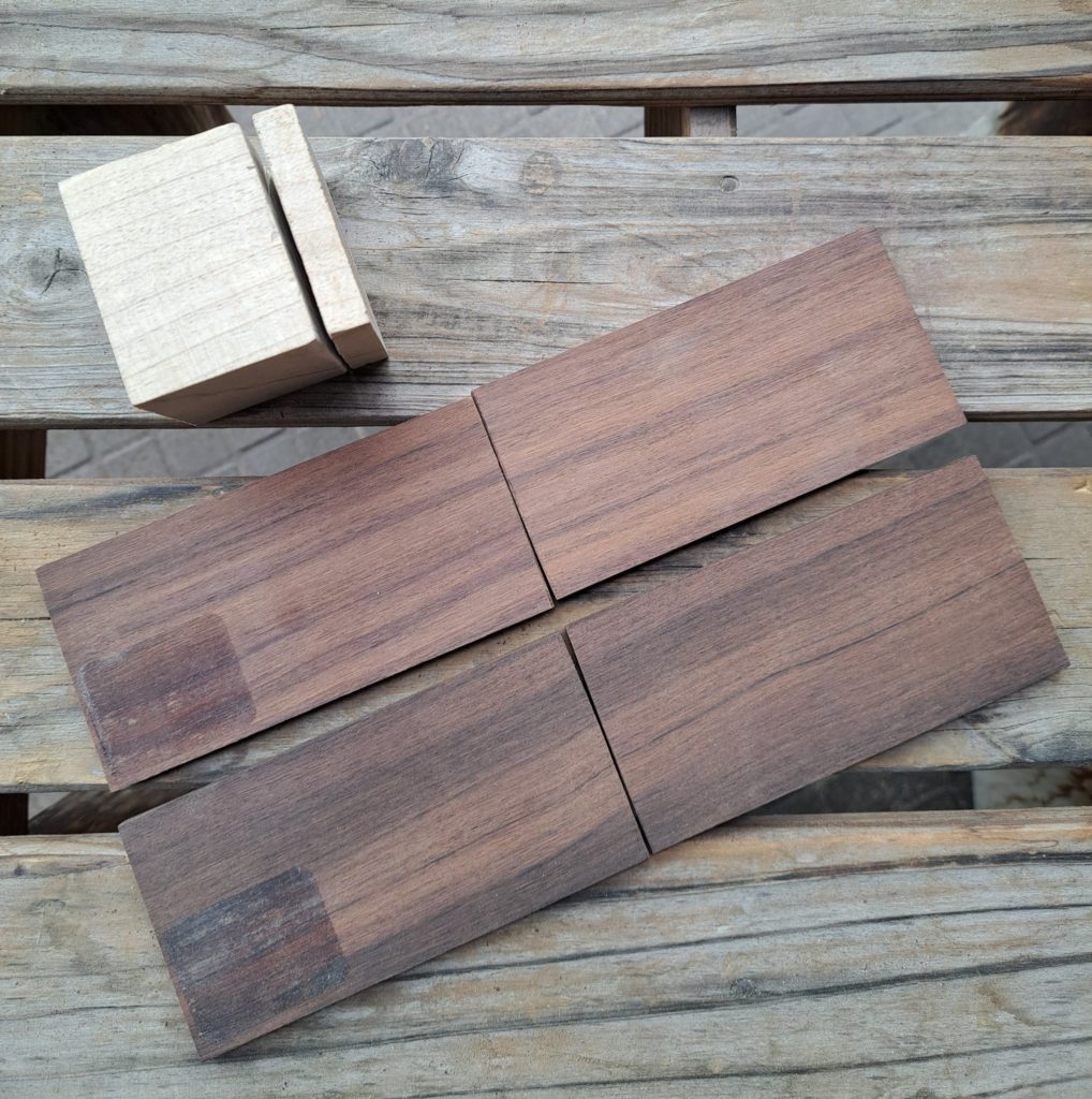 まず、東急ハンズで50×200×5mmのローズウッド薄板2枚と45×45×45mmのウッドブロックを買ってきて、薄板は2枚に切り、ブロックは端の5mmを切り落とします。